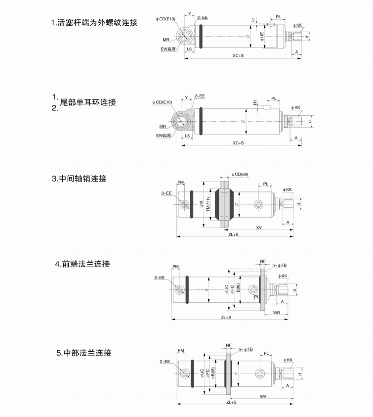 2:缸頭、缸筒連接方式 1=缸頭耳環帶襯套;2=缸頭耳環帶關節軸承;3=鉸軸(用于缸徑≥80卡鍵式連接);4=端部法蘭(用于缸徑≥80卡鍵式連接);5=中部法蘭(用于缸徑≥80卡鍵式連接)
